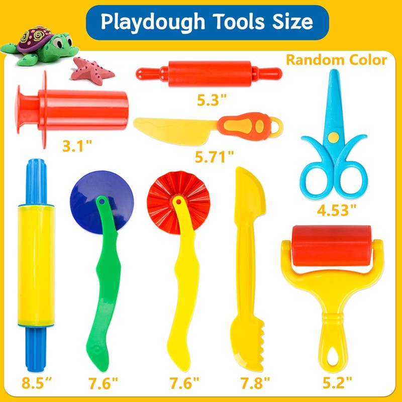 - Basic Playdough Toolkit: Pizza straight cut roller,child-friendly playdough scissors and knife, jagged-edged roller, good-sized rolling pin,roller press, double-sided modelling tool, dough extruders. Note: Tools only, without clay.