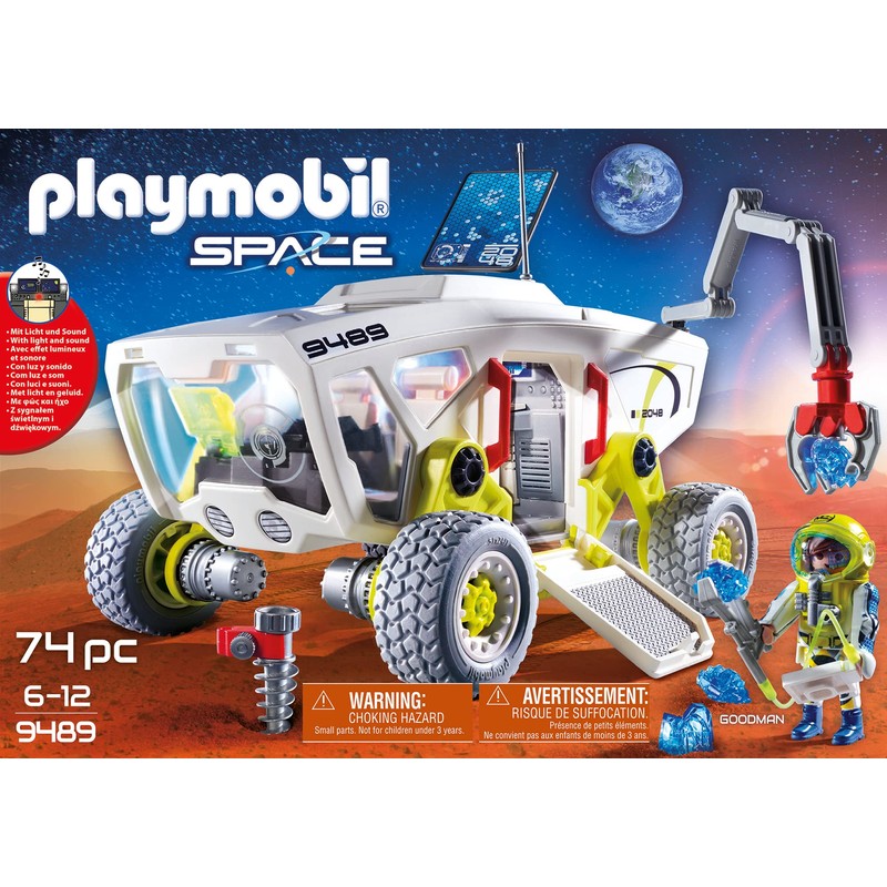- Contents: 1x PLAYMOBIL Space Mars Research Vehicle, 74-piece play set with instructions: 1 Mars exploration vehicle, 73 accessories (2 x AAA batteries not included), Material: BPA-free plastic, LxWxH: 26x17x18 cm, 9489