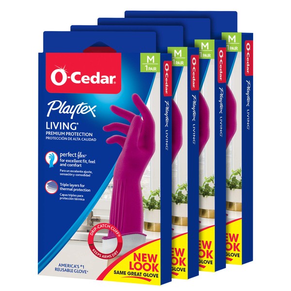 O-Cedar Playtex Gloves Living Reuseable Rubber Cleaning Gloves, Premium Protection, Size - Medium (1 Pair) - 4 Pack