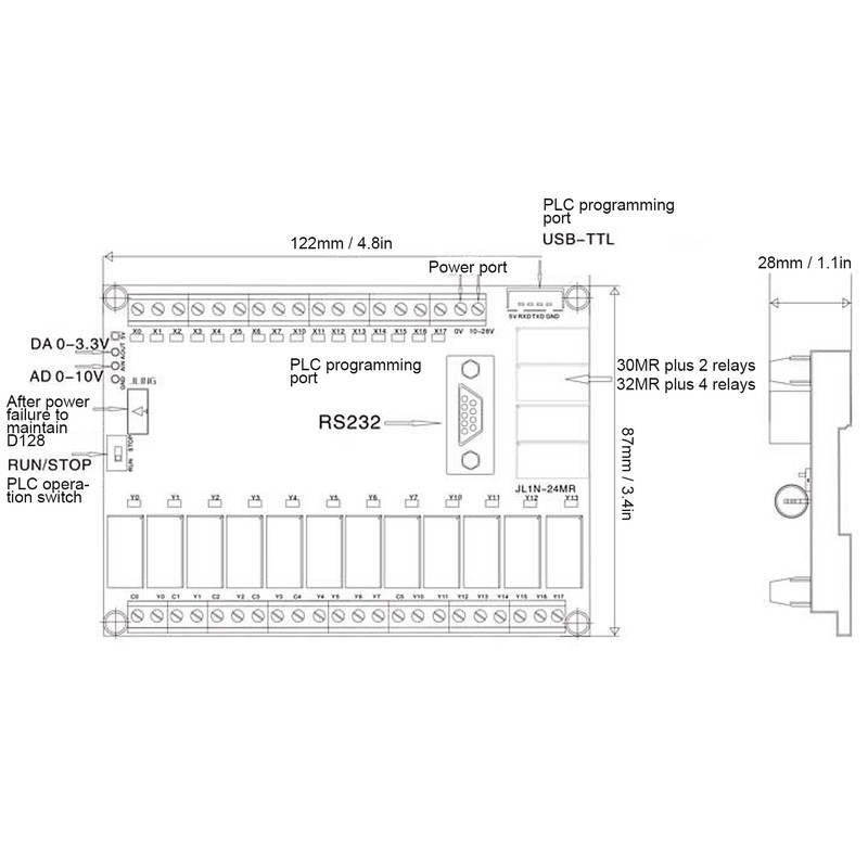 This PLC series has 2 independent 232 serial ports, one is 232 level 9pin port (2: TXD 3: RXD 5: GND), the other is TTL Level 4pin Port (1: GXD 2: TXD 3: RXD 4 : 5V), both of these ports are programmable and connected to the touch screen. When programming, the 9pin port uses the USB-232 cable; the 4pin port uses the USB-TTL cable. When connecting the touch screen, the 232 level 9pin port is directly connected to the touch screen with a 9pin male to female wire (actually only 3 wires are used, namely 2-2, 3-3, 5-5). The TTL level 4pin port needs to use our company's TTL to 232 conversion board to convert to 232 level before it can be connected to the touch screen.