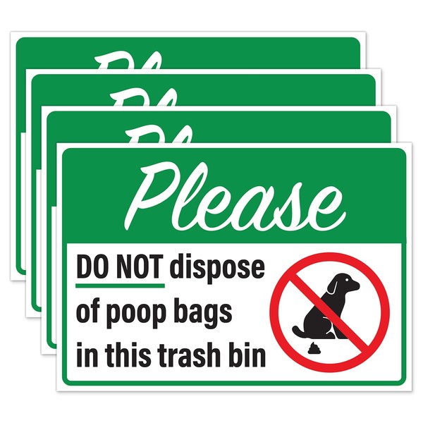 Please Do Not Dispose Poop Bags in This Trash Bin Stickers, Self Adhesive Weatherproof Vinyl Stickers, Green/White, 10" x 7" - Pack of 4