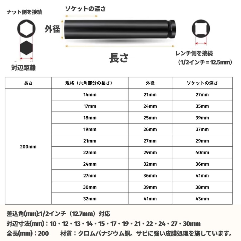 • [Insertion angle]: Compatible with 1/2 inch (12.7 mm)] [Opposite side dimensions] 0.4, 0.5, 0.5, 0.6, 0.7, 0.7, 0.8, 0.9, 0.9, 0.9, 0.9, 0.9, 0.9, 0.9, 1 inches (1224, 124, 224, 24, 24, 24, 24, 24, 24, 24, 24, 30 mm). [Total length] Chrome vanadium steel. Coated with a rust-resistant coating