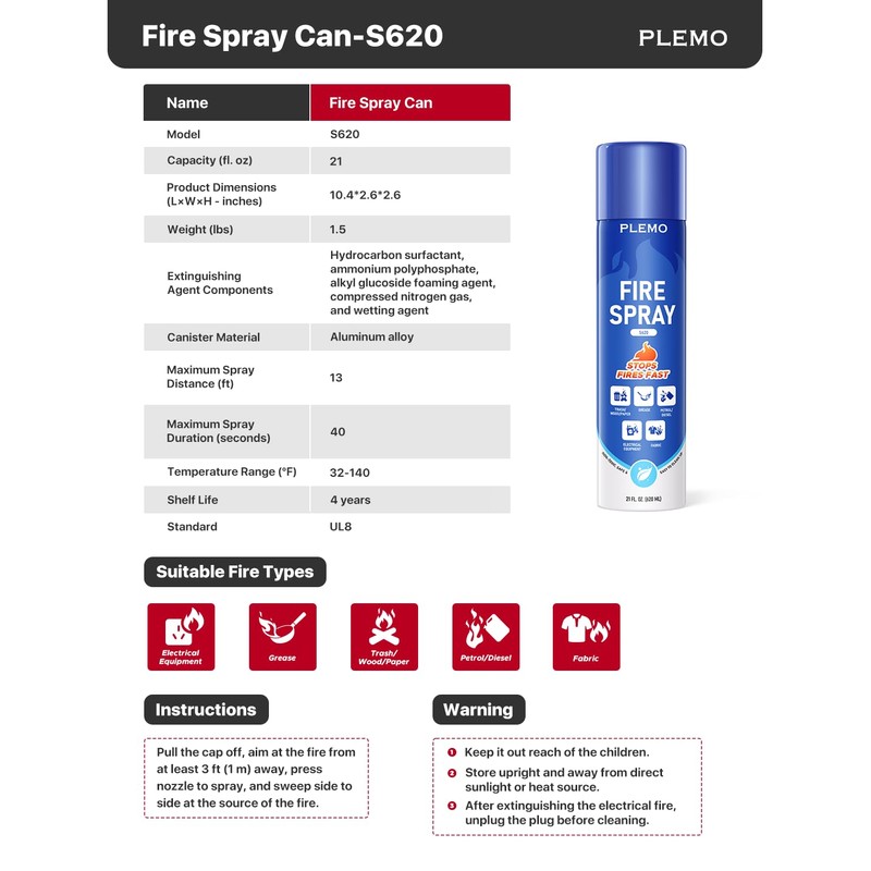 PLEMO Fire Extinguisher, Small Fire Extinguisher for Home, Fire Spray for Kitchens, Vehicles, Cars, RVs, Garages, Trucks, Camping, Model S620, 1-Pack