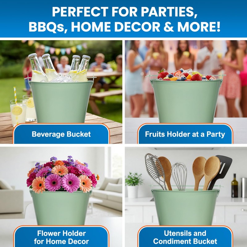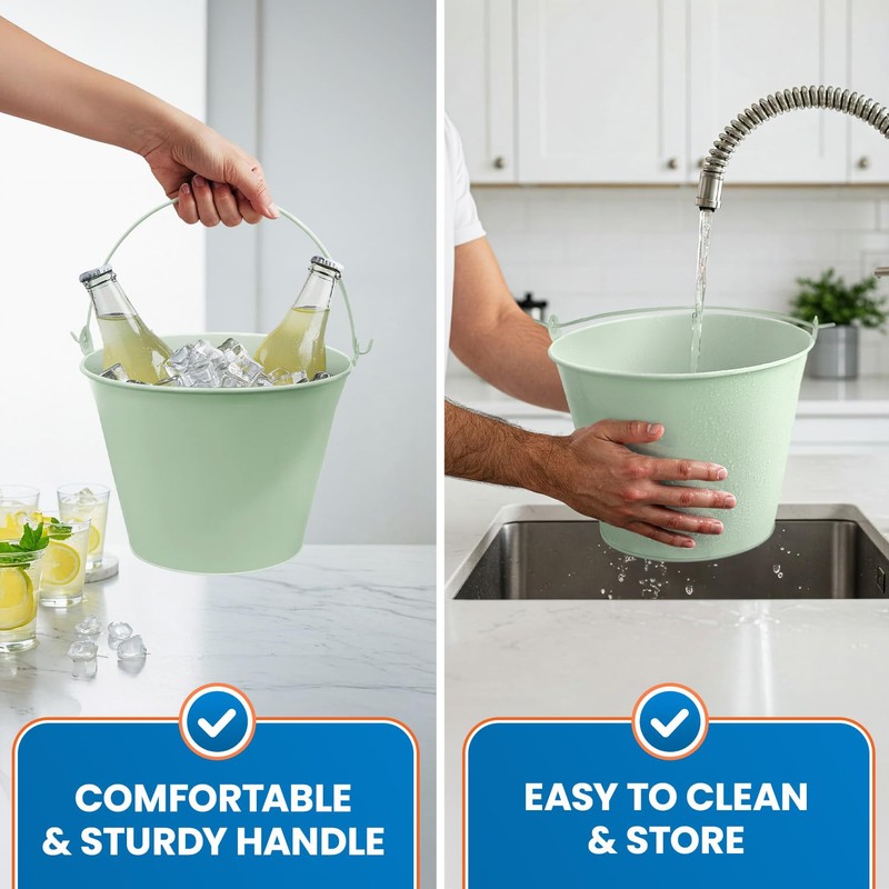 • Easy to carry and transport – The built-in handle makes this small metal bucket easy to move, even when full. Whether using it as a champagne cooler bucket, metal pail bucket, or party bucket for drinks, portability is a breeze.