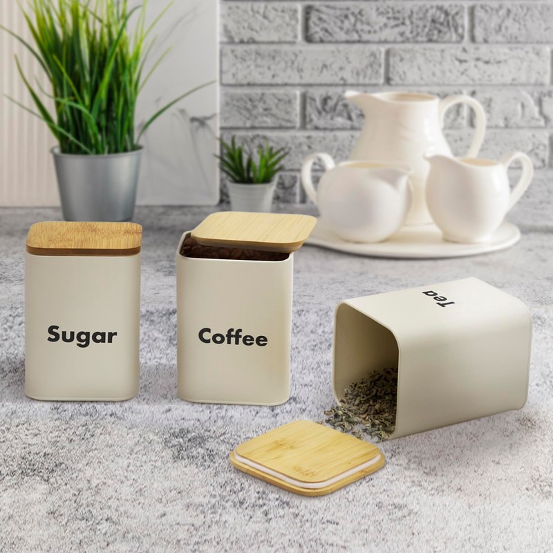 - The 4.49" x 4.49" x 5.32" metal jar set includes three essential containers, featuring a white sugar jar, coffee jar, and tea jar, each equipped with an airtight bamboo lid for optimal freshness