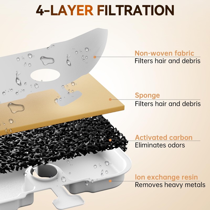 - Powerful Filtration System - 1. non-woven fabric filters cat hair and impurities; 2. activated carbon removes odour; 3. ion exchange resin removes heavy metal ions and softens water; 4. sponge filters out debris and prevents clogging of the pump.