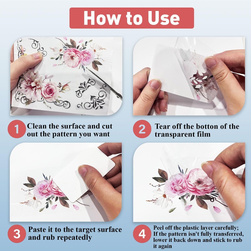- Wide Usage: The friction on the transfer sticker can be applied to most smooth surfaces such as glass, paper, canvas, leather, porcelain, metal, and wood, making it perfect for decorating your furniture and handicrafts