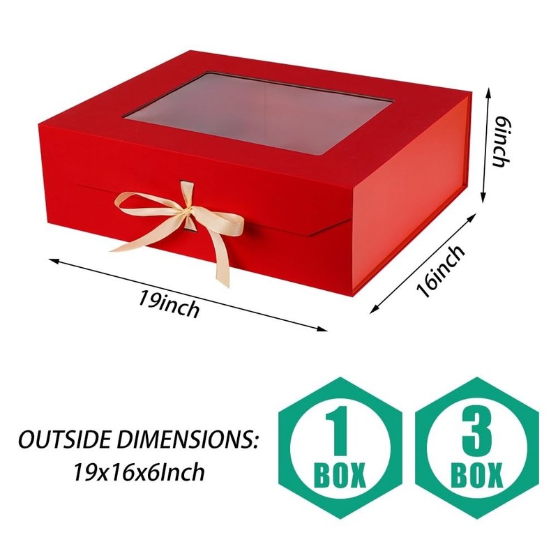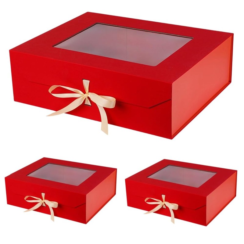 PLINJOY 3 Pcs Extra Large Red Gift Box for Presents with Ribbon 19x16x6 Inches Clear Gift Box with Window Magnetic Closure Gift Boxes with Lids