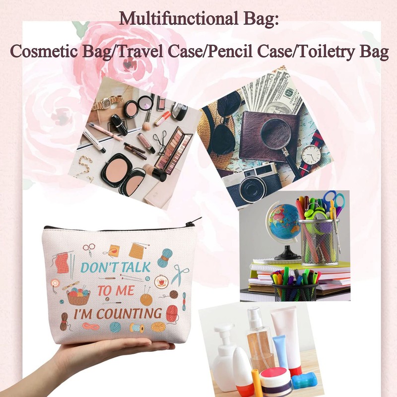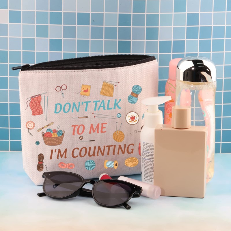 - Bag with Words: DON'T TALK TO ME I'M COUNTING. This funny knitting cosmetic bag is a great gift for your crocheting mom, grandma, sister, friend, daughter.