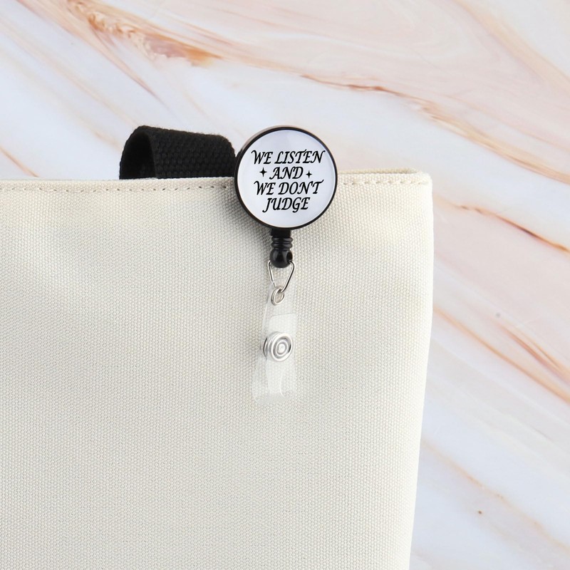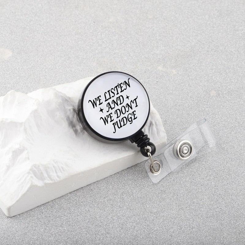 - ★Badge reel with lettering: WE LISTEN AND WE DON'T JUDGE.