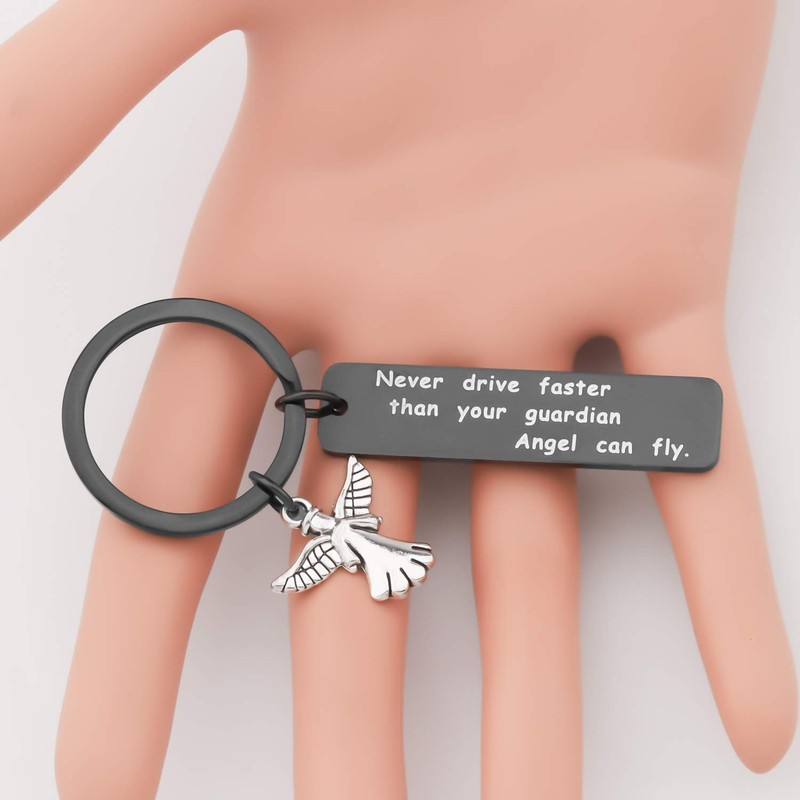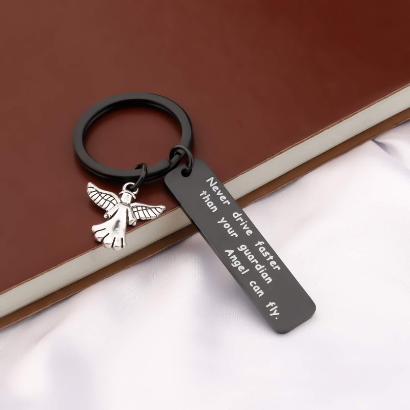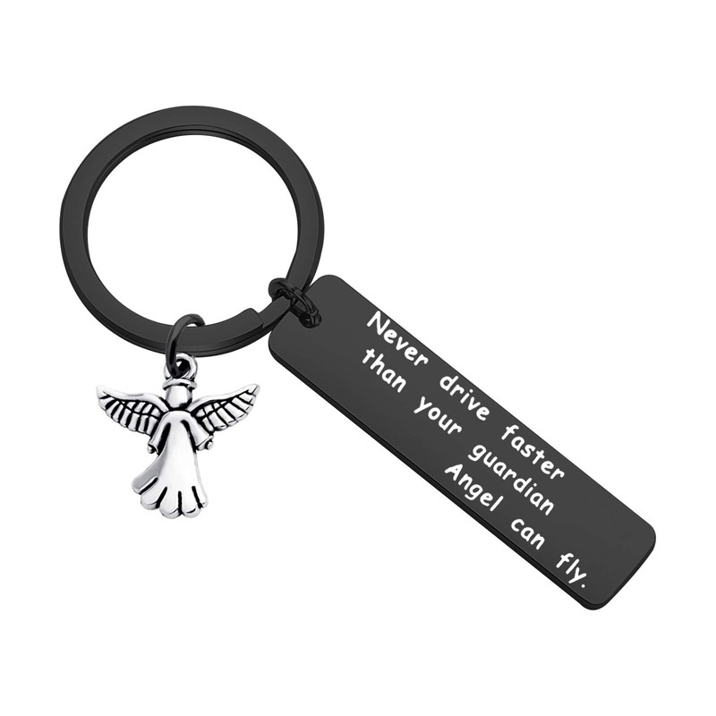 - Never Drive Faster Than Your Guardian Angel Can Fly Key Chain:Stamped with " Never Drive Faster Than Your Guardian Angel Can Fly", meaningful and personalized gift for teens who are new drivers. A great gift for a Sweet 16 birthday,any parents that has a child with a driving permit.,or Daddy Mommy new drivers, It is a perfect reminder accessory to remind your loved one to drive safely.