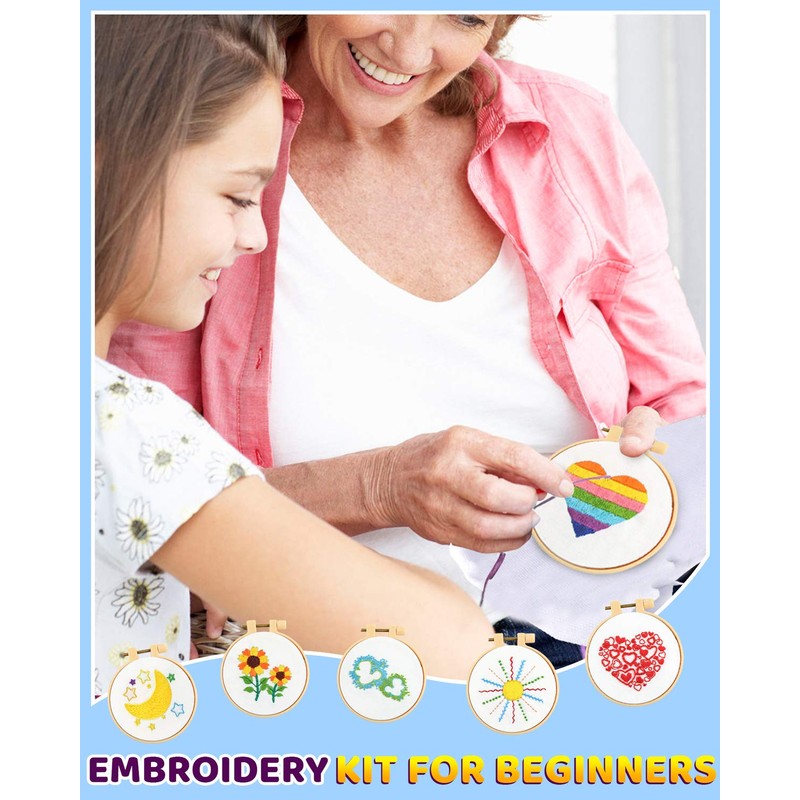 - The Funny kit: Includes 10pcs embroidered fabrics with patterns, 5 embroidery hoops, 15 embroidery threads, 10 needles and instruction
