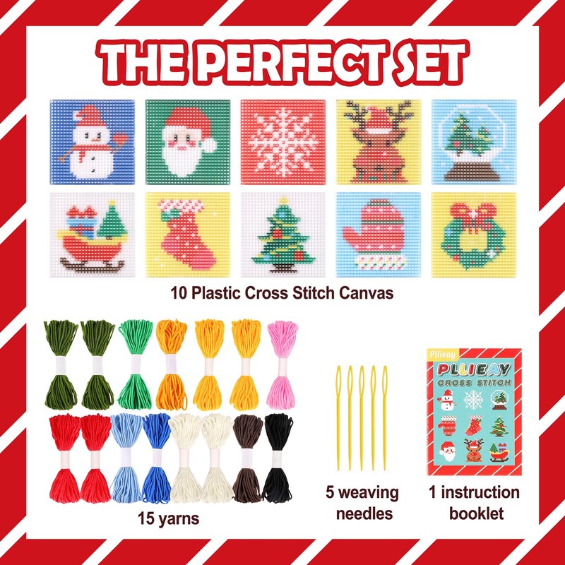 Pllieay Christmas 10-in-1 Cross Stitch Beginner Kit for Kids, Includes Instruction of 10 Different Patterns, 10 Printed Plastic canvases for Needlework, Needlepoint Starter Sewing Set