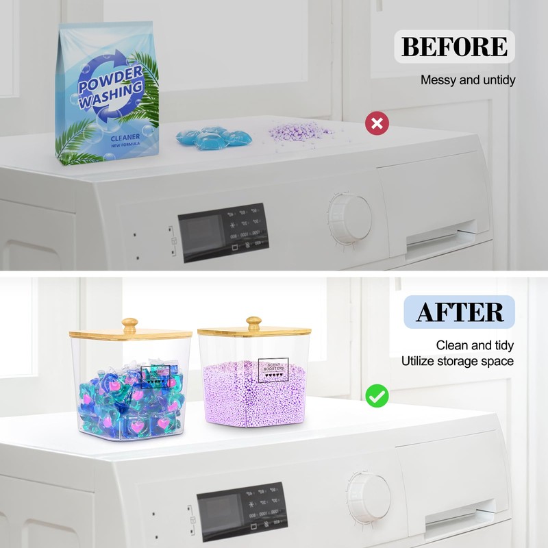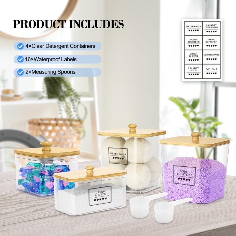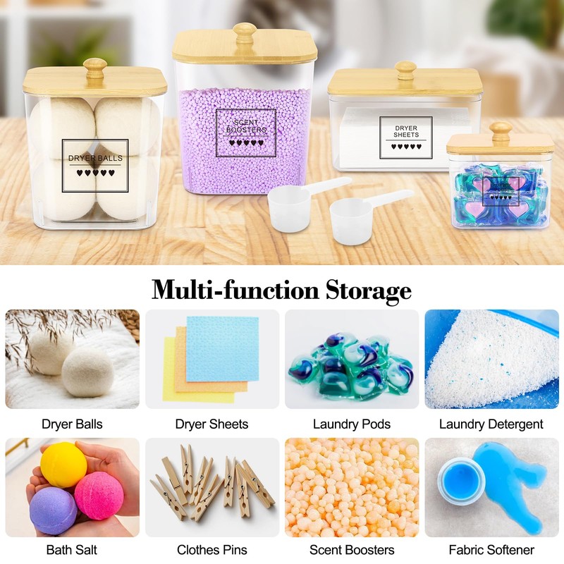 - Laundry Pods and Dryer Sheets Container Set: This laundry scent booster container set includes three clear containers with bamboo lids, two scoops, and eight waterproof labels. These containers are perfect for organizing and storing items in your laundry room, kitchen, bathroom, and other areas of your home. The laundry detergent containers are dishwasher safe, while the bamboo lids can be easily cleaned with a damp cloth
