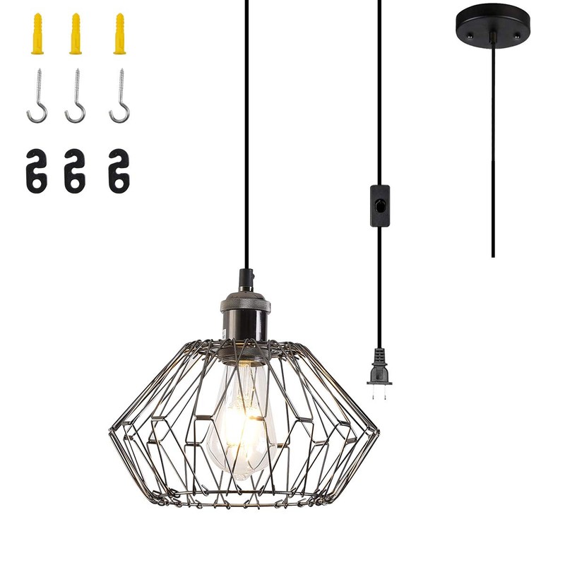 Plug in Pendant Light, Hanging Light with Plug in Cord ,Black Folding Cage Industrial Plug in Hanging Light,Pendant Lighting Plug in Light fixtures for Hallway,FLiving Room,Kitchen