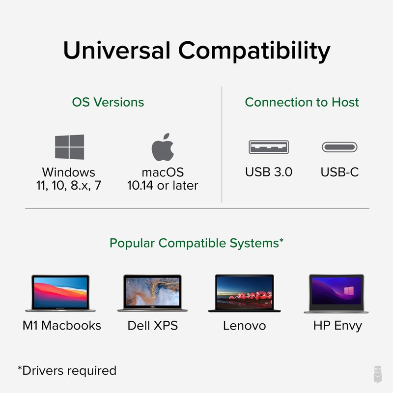 Requires Intel / AMD / NVIDIA main GPU and driver with Windows Aero enabled. USB graphics require dual-core 2GHz+ CPU for best performance. If connecting via USB 3.0, up-to-date USB drivers on host system recommended.