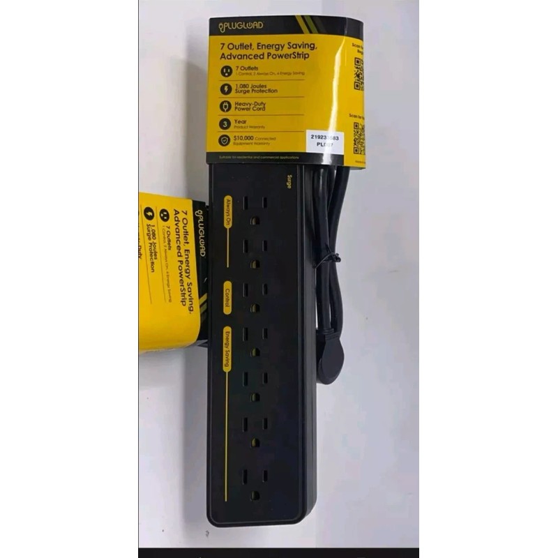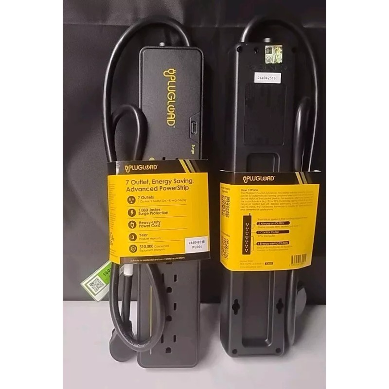 The product is a set of 2 Plugload 7-outlet energy-saving surge protectors in black color. Each power strip has a surge energy capacity of 1081 joules and features indicator lights for power and surge protection status. The power strips are designed with a flat plug for convenience and heavy-duty construction for durability. They operate at an input voltage of 120V and have an output voltage of 120V. These power strips are suitable for home and garden electrical needs, providing multiple outlets for various devices while ensuring they are protected from power surges.
