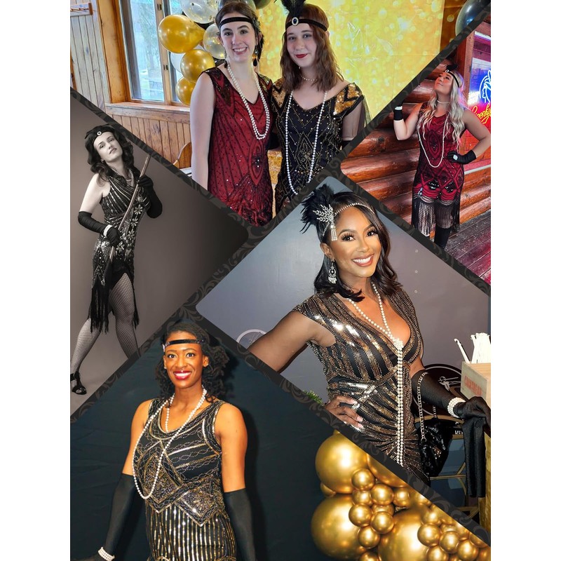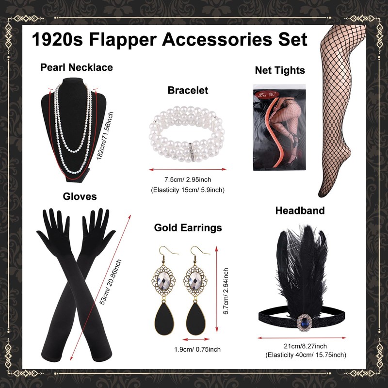 - 1920s accessories set for women: 10 pieces in total: 1 pair of black long gloves (2 pieces), 1 pair of earrings (2 pieces), 1 pearl necklace, 1 black cigarette holder, 1 flapper headband, 1 faux pearl bracelet, 1 pair of fishnet tights, 1 Great Gatsby party dress