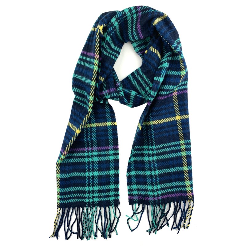 Plum Feathers Plaid Check and Solid Cashmere Feel Winter Scarf, Warm Scarfs, Cold Weather Accessories, Fringe Scarves (Navy Turquoise Plaid)