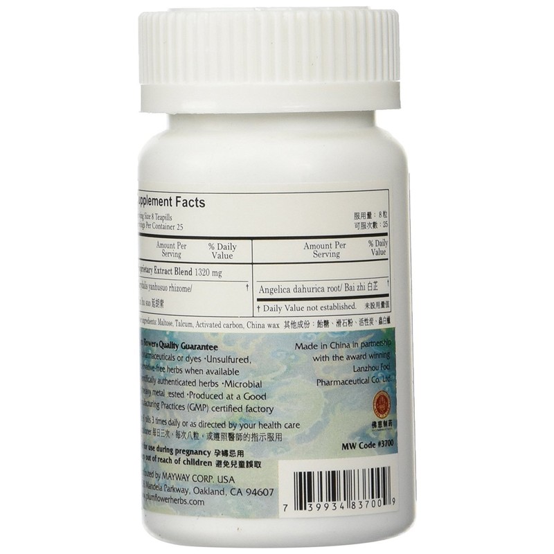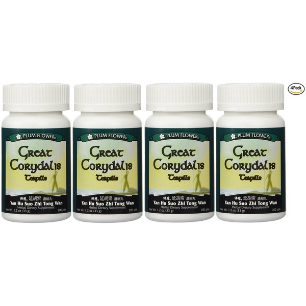 Four bottles of 200 teapills or 800 teapills total, an approximately 32 day supply. Plum Flower Great Corydalis Teapills also goes by the Pin Yin name Yan Hu Suo Zhi Tong Wan. This formula has long been used in Traditional Chinese Medicine. The ingredients in a proprietary extract blend: Corydalis Yanhusuo Rhizome (Yan Hu Suo), and Angelica Dahurica Root (Ba Zhi). Mayway product 3700.