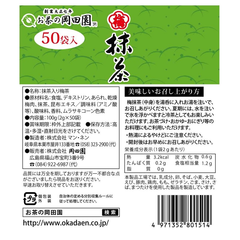 - Name: Plum tea with matcha tea; Ingredients: Salt, Dextrin, Plain, Dried Plum Meat, Matcha, Kombu Extract, Seasoning (amino acids), Oxidizer, Fragrance, Murasaki Corn Pigment