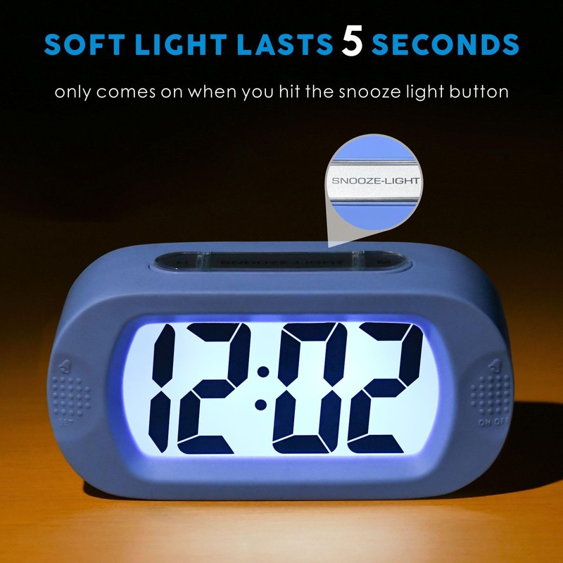 - Plumeet Digital alarm advantage: easy setting, LCD giant number display for easy reading with good night light, soft light keeps your sleep and lights up for 6 seconds when pressed, hand-held large good for travel, cute colour for children.