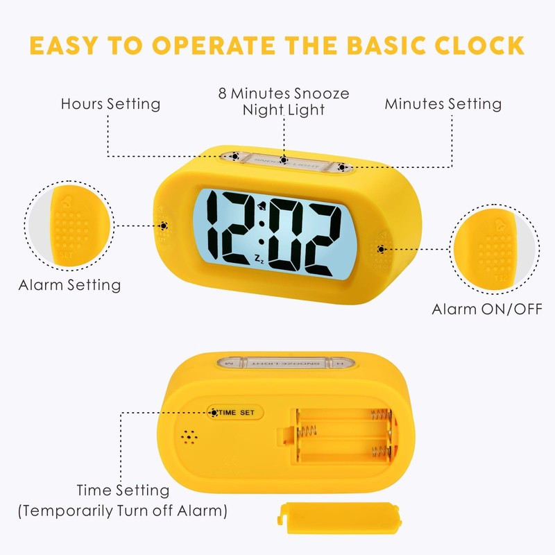 • Plumeet Digital alarm advantage: easy setting, LCD giant number display for easy reading with good night light, soft light keeps your sleep and lights up for 6 seconds when pressed, hand-held large good for travel, cute colour for children.