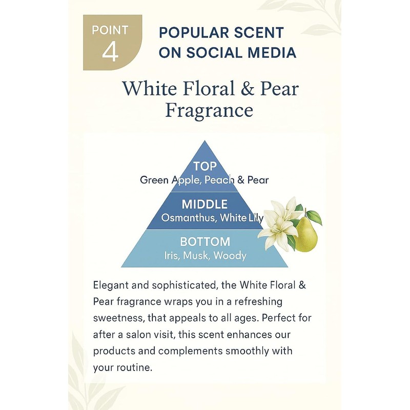- Refreshing white floral & pear scent