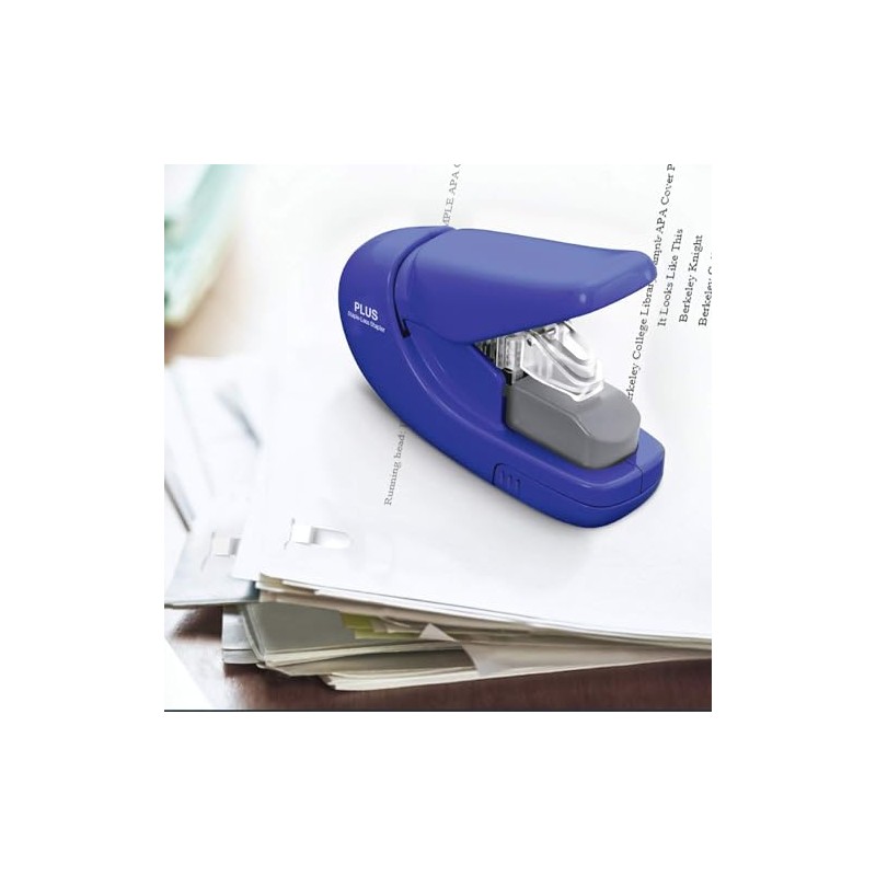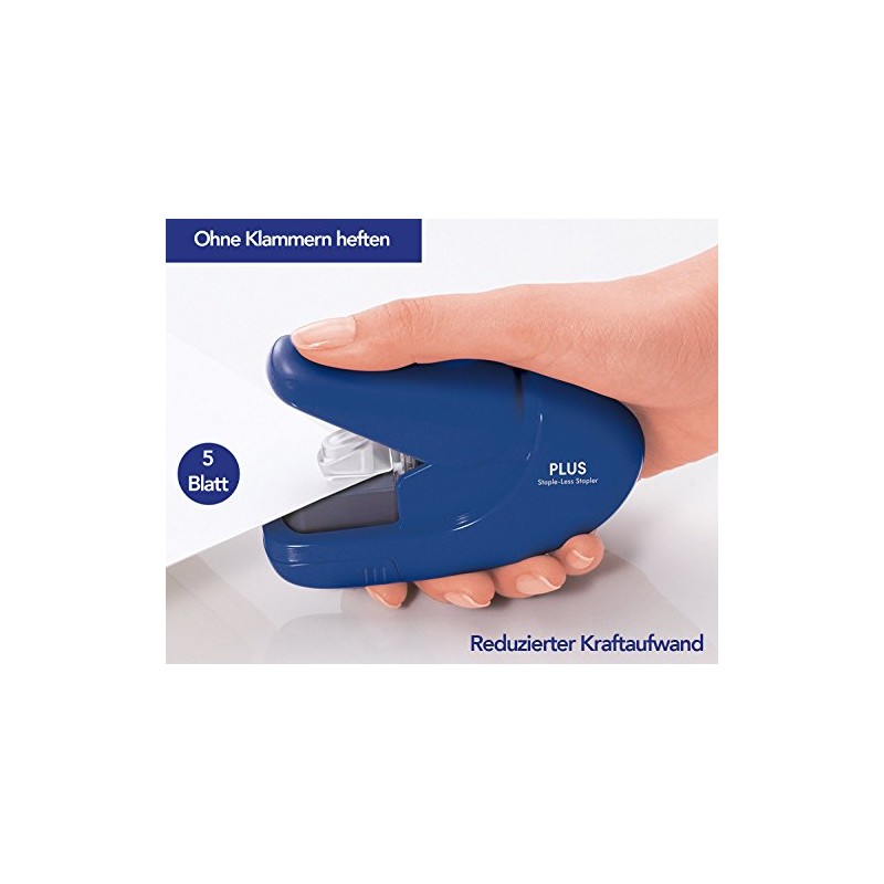 PLUS PLUS, Klammerloser Hefter, Heftleistung 5 Blatt, japanische Hefttechnik, heften ohne Klammern, Paper Clinch, Blau