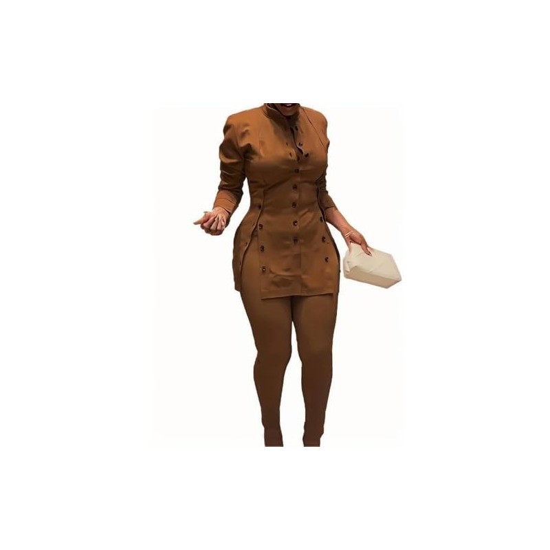 Plus Size Women's Button-Front Blazer and Pants Set, Curvy Long Sleeve Professional Two-Piece Suit (US, Alpha, 4X-Large, 5X-Large, Regular, Regular, Brown)