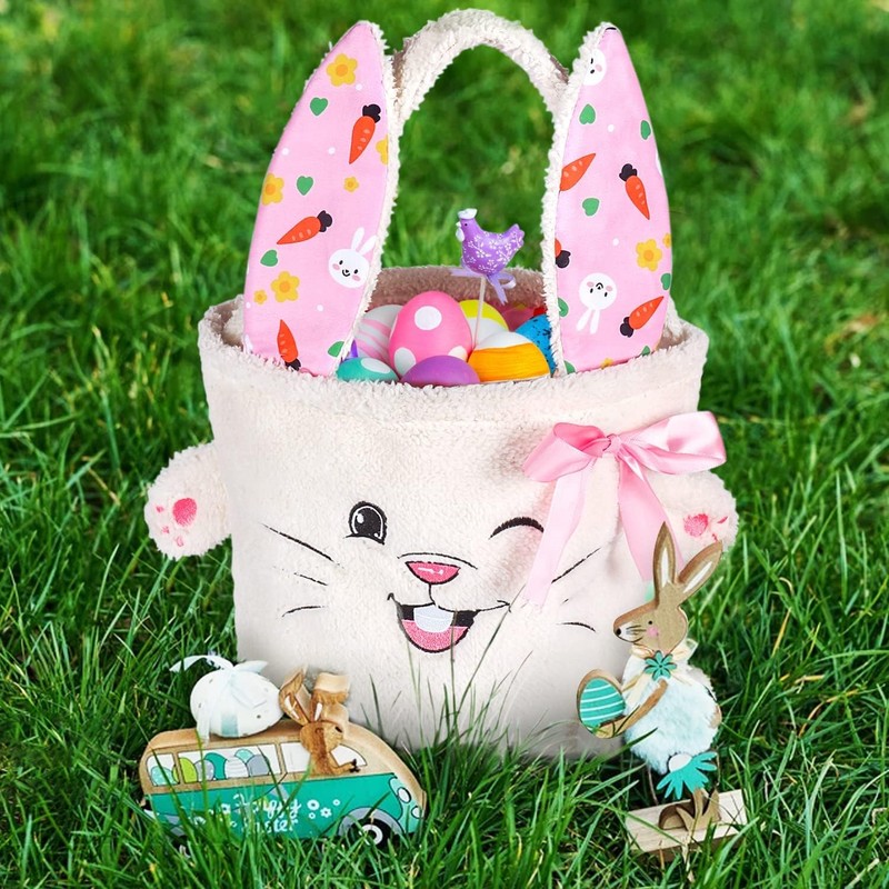 • 🐰【EXQUISITE EASTER SPIRIT DESIGN】🐰 Our fluffy Easter Bunny Basket features a classic and charming bunny design. With a happy face, floppy foldable ears, and a decorative bow-knot, it adds festive Easter cheer to any celebration. A must-have addition to your Easter party supplies, this empty easter baskets is the perfect accessory for Easter egg hunts and will be a hit with kids of all ages!
