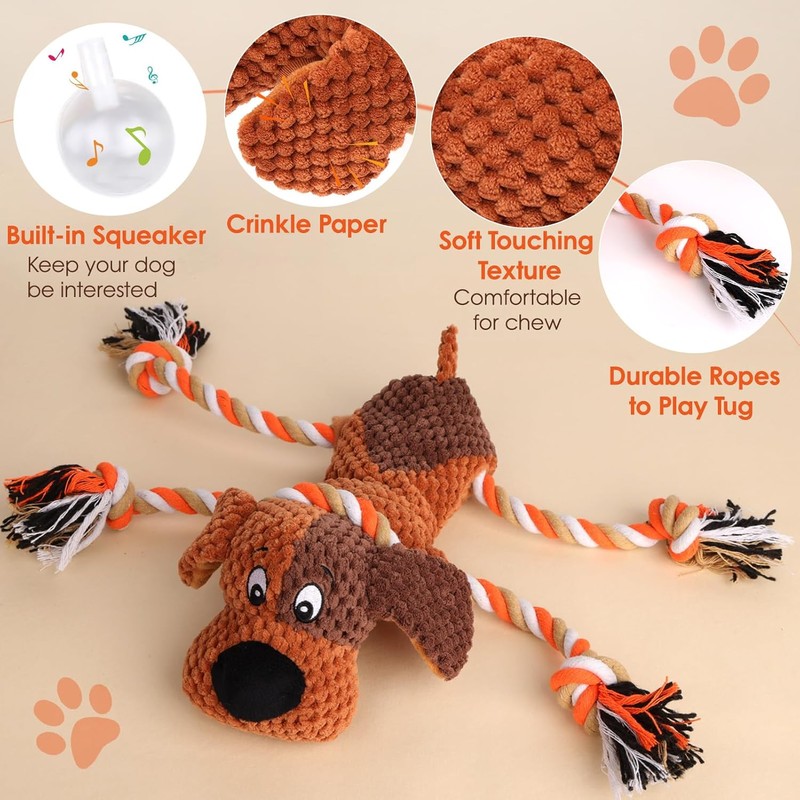 Plush Dog Toys with Rope, Squeaker & Crinkle Paper – Interactive Squeaky Chew Toy for Large Dogs & Puppies – Tough Pet Toy for Tug of War, Fetch & Dental Exercise