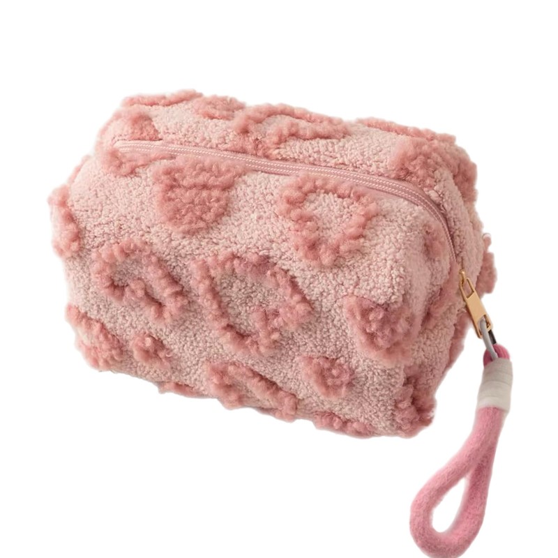 Plush Pink Cosmetic Case with Heart Pattern, Furry Texture, Wrist Strap
