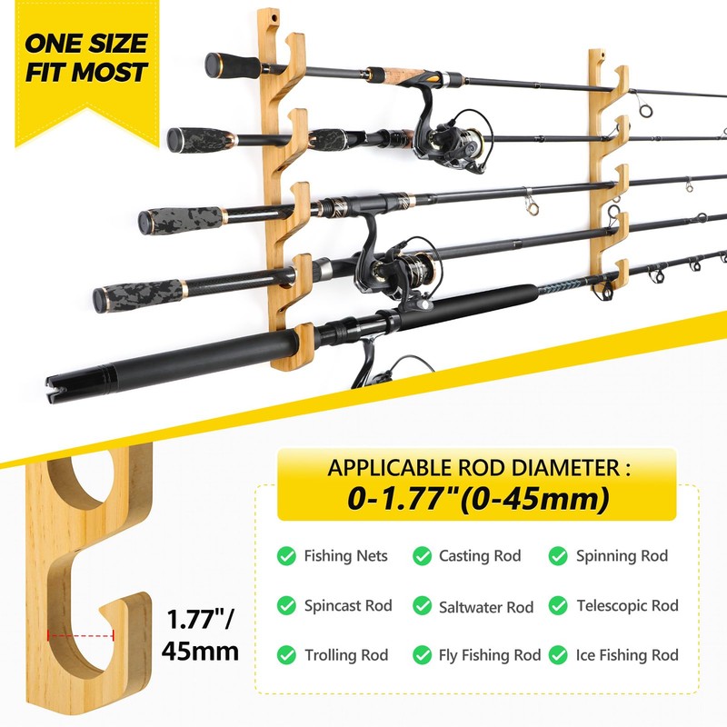 - 【FIT ALL RODS OR COMBOS】 - After an amount of data research, we chose 1.77"/45mm as the diameter of the rod holders for garage, to ensure adapt to all fishing rods on the market! Including saltwater, spinning, casting, trolling fishing rods, part of fishing nets, etc. Meanwhile, allow to hold up to 5 rods or combos in less than 18” of wall space. This is impossible for many other fishing rod storage on the market. The pole holders for garage maximize meet the needs of fishing enthusiasts!