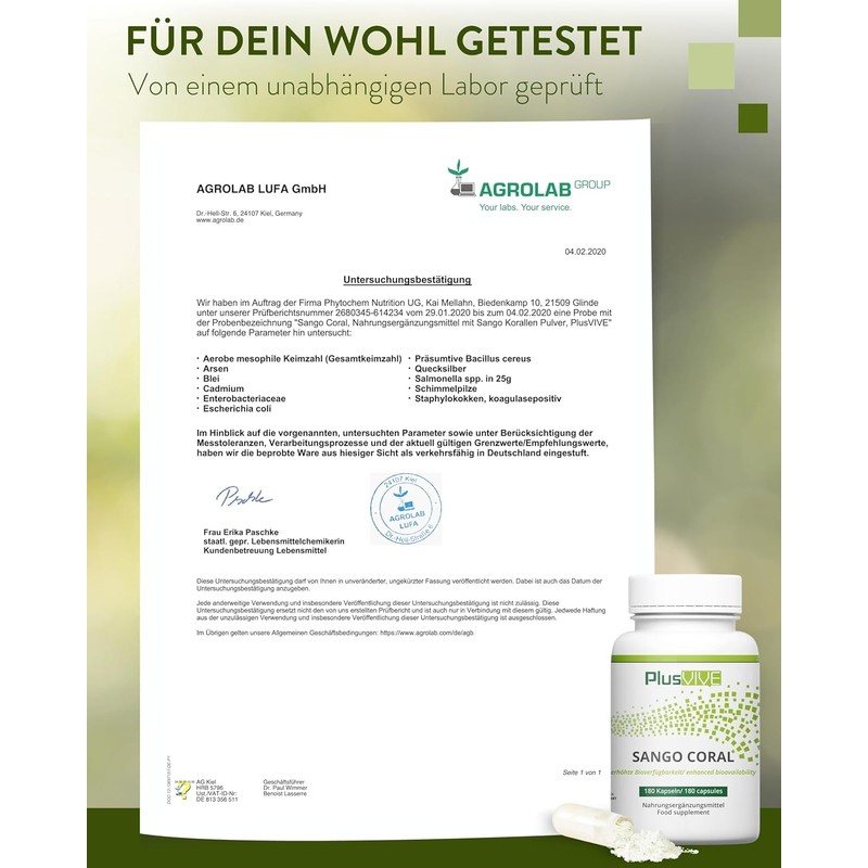 Plusvive Sango coral capsules are regularly controlled by an independent laboratory in addition to our own quality controls. The current certificate can be found in the product images.