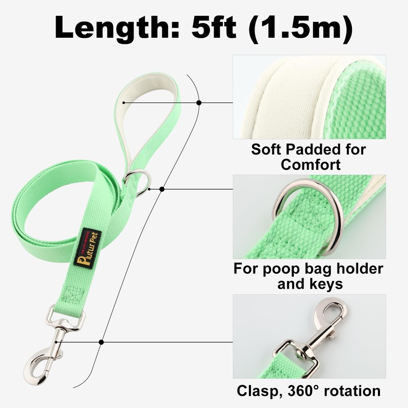 • The leash is 5ft or 150cm long, a perfect length to walk your dog. The XXS and XS sizes are 3/4’ or 2.0cm wide, and the S, M, and L sizes are 1’ or 2.5cm wide. The soft-padded handle ensures your grip remains comfortable, even during those energetic walks. Additionally, the D-ring on the handle provides a handy spot for hanging keys or accessories, adding convenience to your walks.