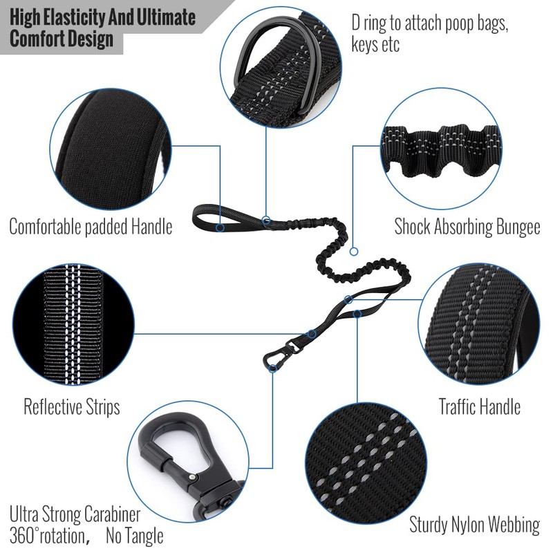 - 【Heavy Duty Metal Buckle】The dog collar has a quick release heavy-duty metal buckle that makes it hard to break, ensuring most safety of your dog. The shock-absorbing bungee lead has an elastic rubber band inside, so that the leash can extend from 120cm to 155cm to provide sufficient space. Moreover, the bungee can reduce injury risk by absorbing the stress and muscle strain for both you and your dog.
