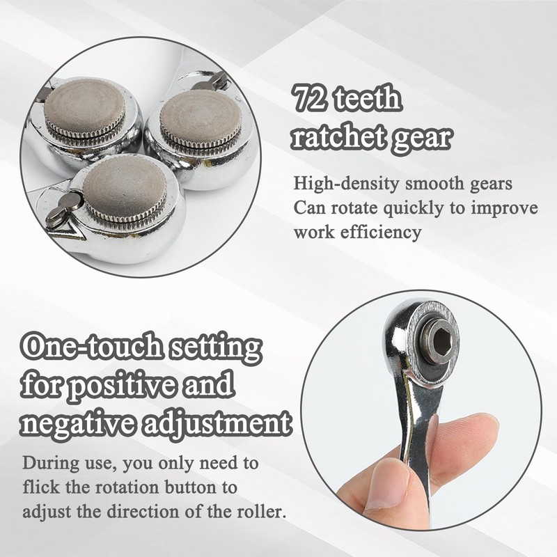 72 teeth 1/4 inch ratchet, made of alloy, efficient rotation, durable, corrosion-resistant, portable and practical, strong magnetic attraction, curved handle. Small ratchet allows you to easily complete various tasks in a small space - professional and practical - with just one click, everything gets done!