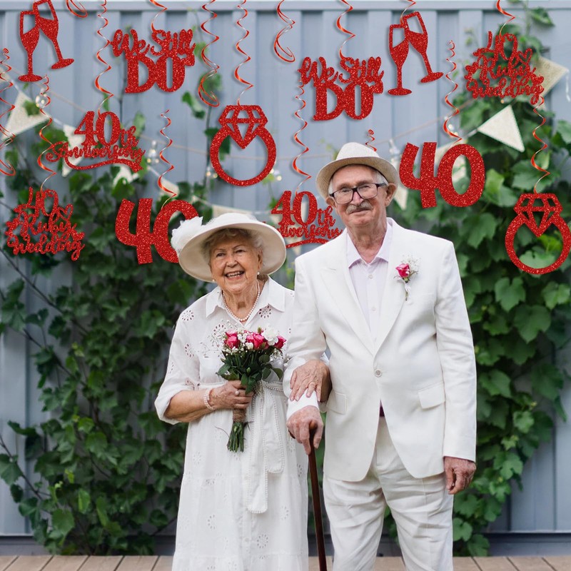 - 40th Wedding Anniversary Party Decorations Kit: This 40th Anniversary party hanging swirls set has 12 pieces of housewarming themed cards in 6 different patterns, 12 pieces single spirals with cards and 6 pieces double spirals without cards. a total of 18 foil swirl decorations.