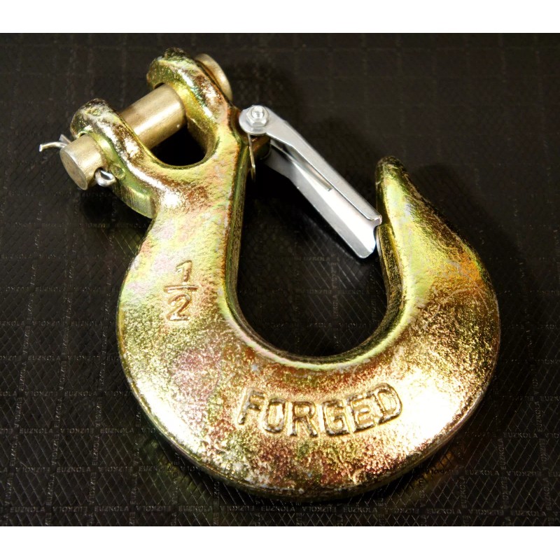 Drop forged, medium alloy steel hook, quenched and tempered then zinc plated. Use with Grade 70 transport chain. Hook is 5" wide and 6 1/2" tall with 1 1/2" wide opening at latch, clevis pin is 5/8" diameter.