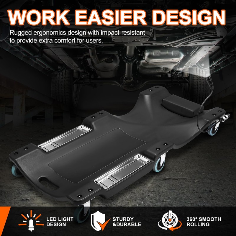 - [Swivel Casters] The 360° swivel casters allow the Creeper to glide smoothly and effortlessly in any direction, making it easier to position yourself under the vehicle. This improves efficiency and reduces strain, enabling you to work more comfortably and productively.