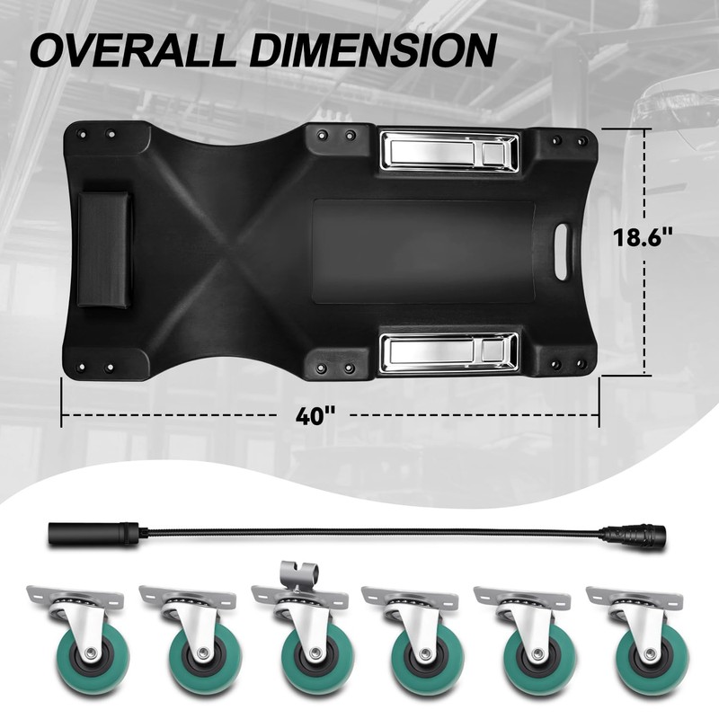 - [Product Info] Come with 1 x LED Light & 1 x 40" Creeper Black with 6pcs 360° smooth rolling swivel casters wheels. Overall Dimensions: 18.6" x 40" size / Material: Plastic