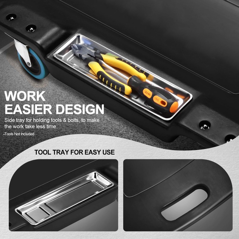 - [Portable Design] Having dual side storage trays on a Creeper for easy access to tools and parts, keeping them organized and within reach. This reduces the need to repeatedly climb out of the Creeper, saving time and effort.