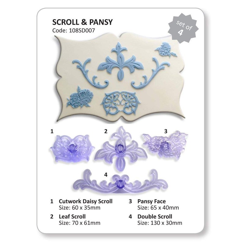 - Create beautiful cut outs and indentations to add intricate patterns on to any celebration cake with this set of 4 scroll and pansy cutters