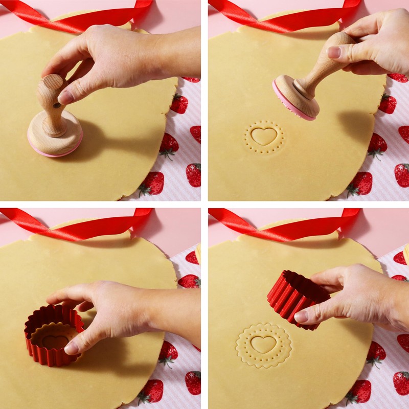 - Includes 4 x silicone stamps (6cm diameter), 1 x round scalloped cookie cutter, 1 x wooden handle