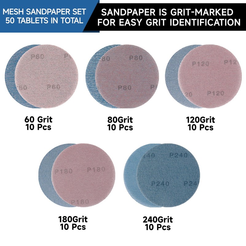 - [Complete Set]: 125mm sanding discs (50 pieces 180 grit), Drywall sanding mesh with anti-tear reinforcement, Multi-material sanding pads for tradesmen/DIY enthusiasts.