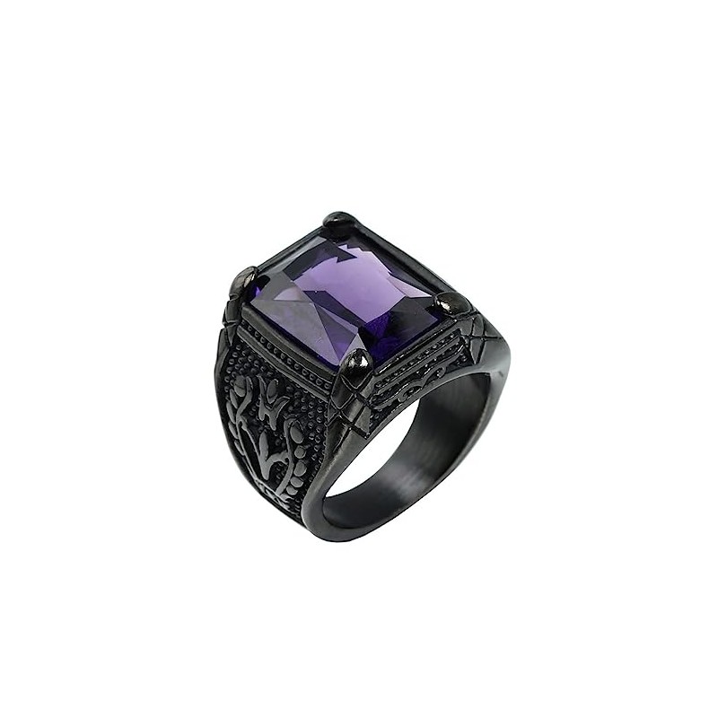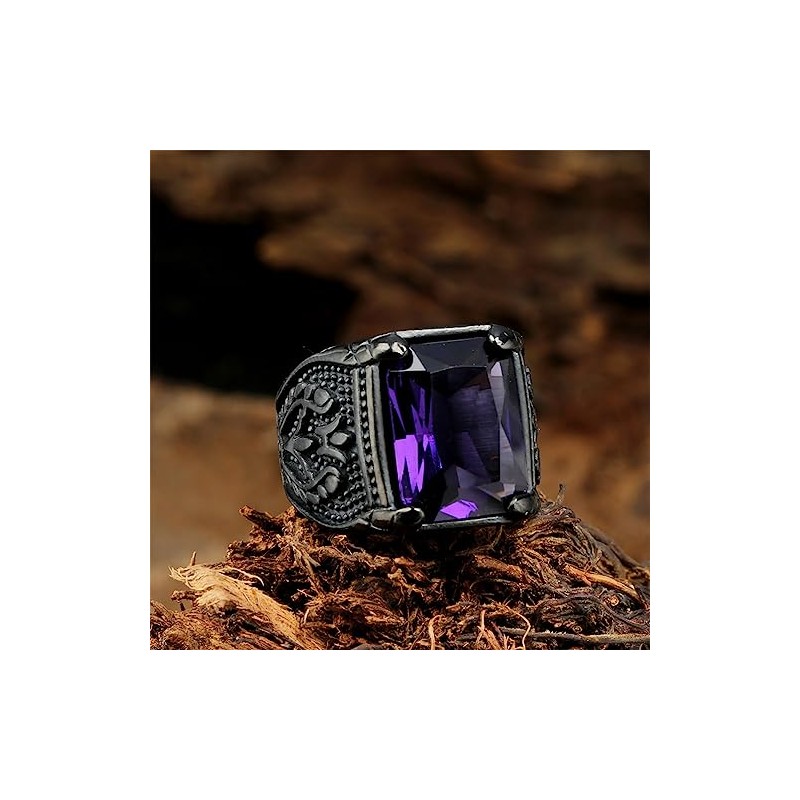 PMTIER Men's Classic Retro Stainless Steel Carved Flower Pattern Cubic Zirconia Square Cut Purple Gemstone Ring Wedding Band Black Plated Size 8
