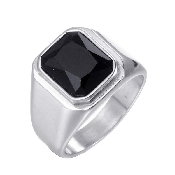 PMTIER Men's Stainless Steel Silver Plated Ring with Square Black Gem Stone Size 9