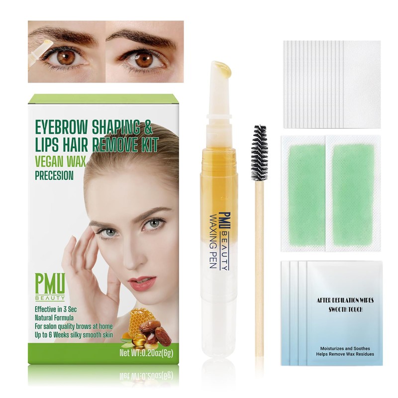 PMUBEAUTY Eyebrow Shaper Wax Kit for Women Eyebrow Facial At-Home Hair Removal with 4 Counts Ready-to-Use Wax Strips for All Hair Types Delicate Areas Cotton Strips Cleansing Wipes 0.2 Ounce