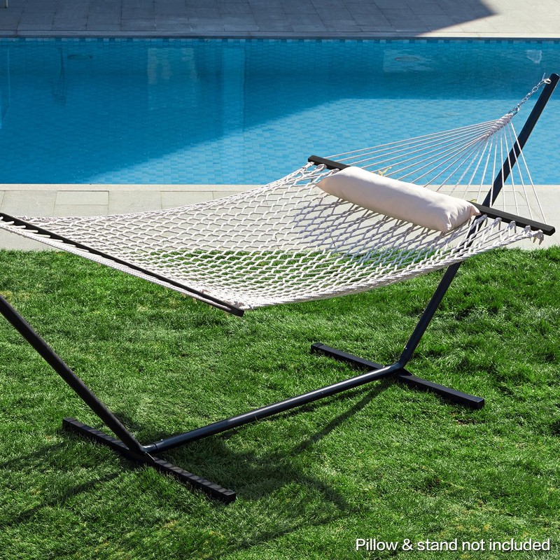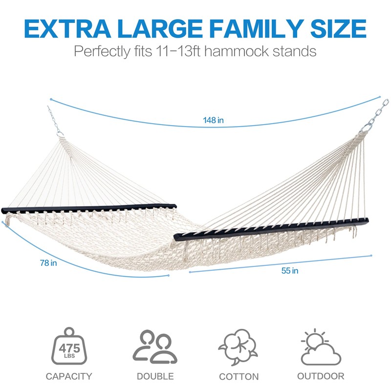 - Heavy-Duty Hardwood Spreader Bar:Built to last with industrial-grade components: reinforced stitching, weather-resistant galvanized steel chains (extra 9" length for flexible hanging), and splinter-free hardwood that withstands 475lbs. Endures years of sun exposure and outdoor elements. you can attach the hammock to a hammock stand or hang it between two trees.